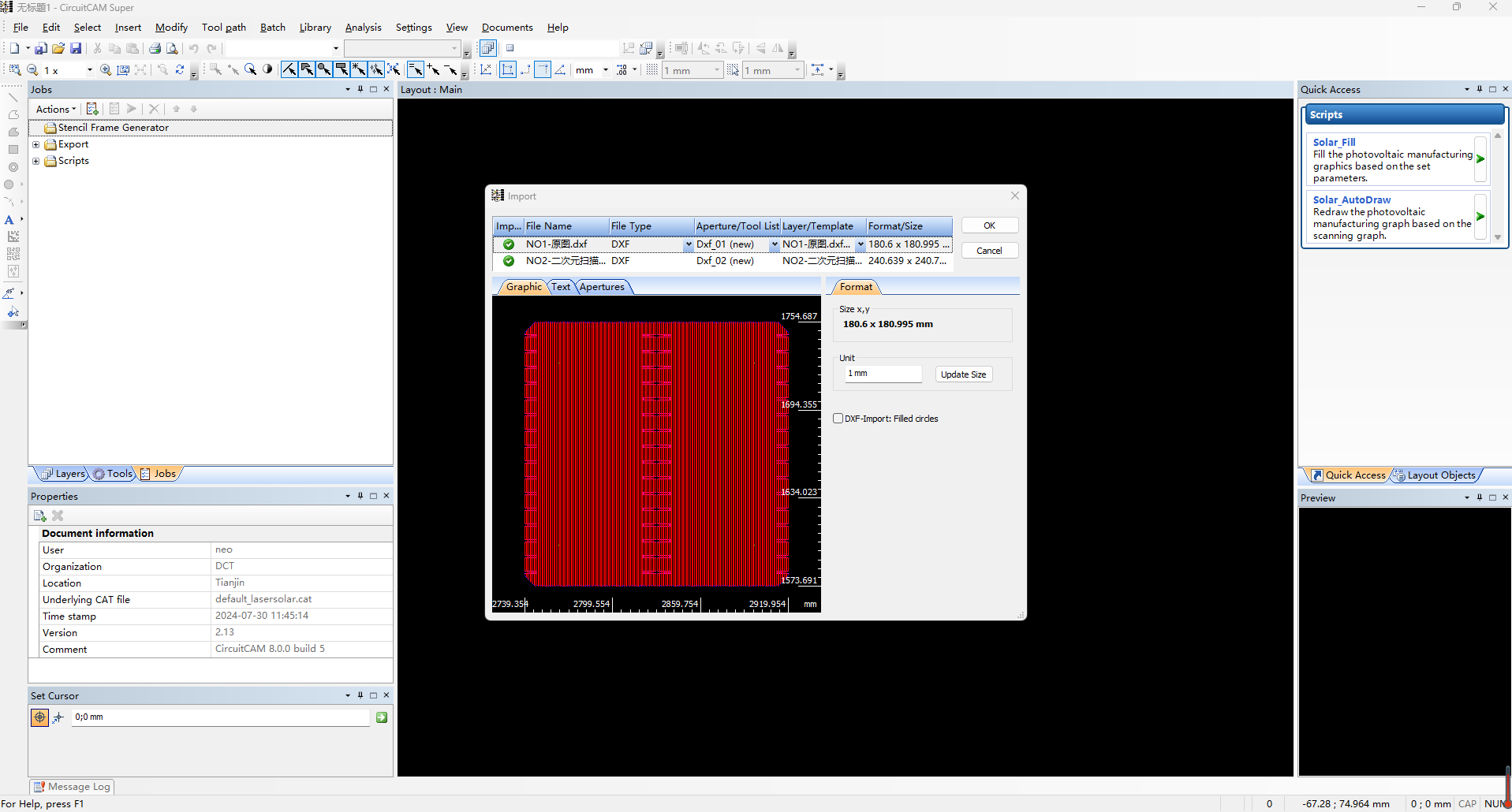 針對(duì)光伏行業(yè)的圖形處理需求,CircuitCAM8推出了LaserSolar模塊。這個(gè)模塊中,針對(duì)特定圖形的快速填充和計(jì)算、快速自動(dòng)制圖等需求,推出了快速完成光伏圖形的填充計(jì)算的Solar_Fill功能;推出了以二次元掃描圖形為基準(zhǔn),一鍵自動(dòng)繪制光伏圖形的Solar_AutoDraw功能。